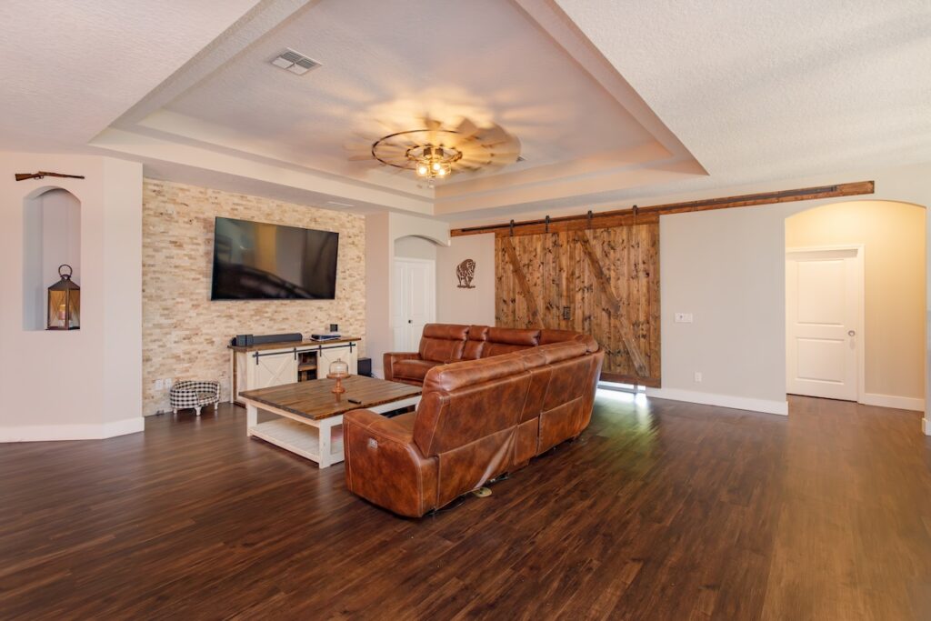Step into the spacious open-concept living room, where thoughtful design comes alive. The stacked stone accent wall serves as a striking centerpiece, creating a cozy yet chic atmosphere. Above, the double tray ceiling not only adds depth and dimension to the room but enhances the overall airiness of the space—making it the perfect spot to gather, unwind, and make memories.