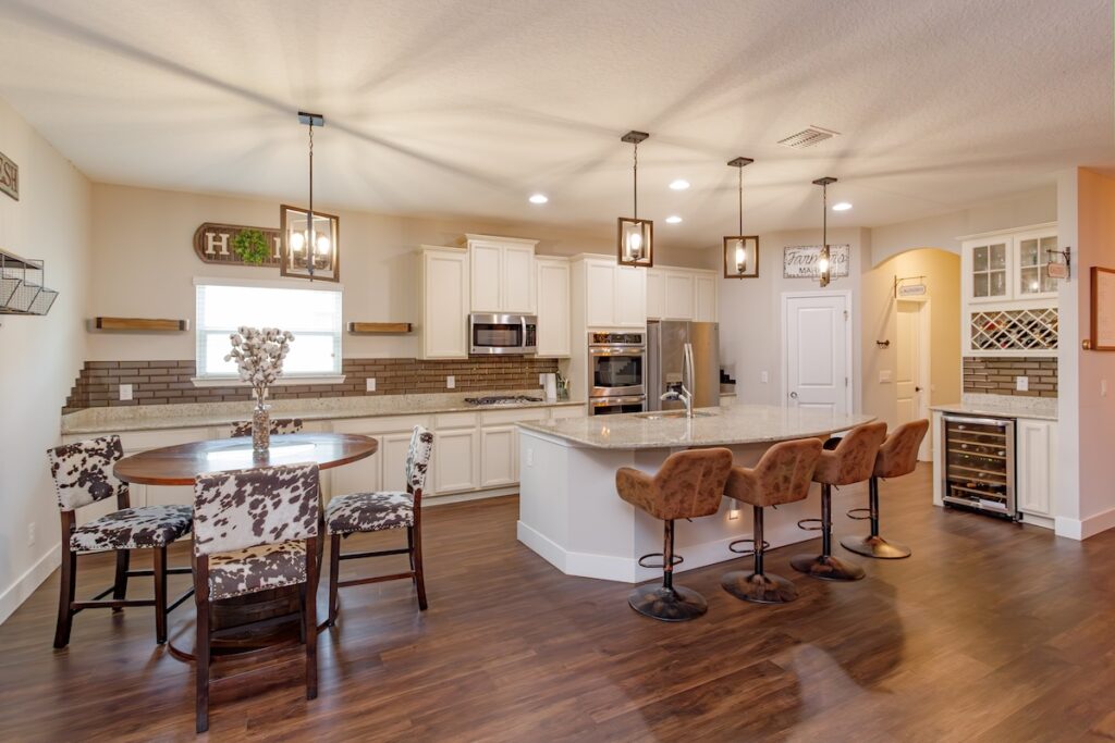 Large sliding doors lead to additional entertainment areas outdoors, allowing the seamless flow of energy and light between spaces that homeowners love.