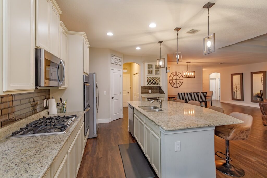 What truly elevates this kitchen is the inclusion of premium appliances, including a double oven, gas cooktop, and a wine refrigerator, offering just the right convenience for dinner parties or a quiet evening at home. Whether whipping up quick weeknight meals or preparing a feast for guests, this kitchen ensures a seamless cooking experience with style.